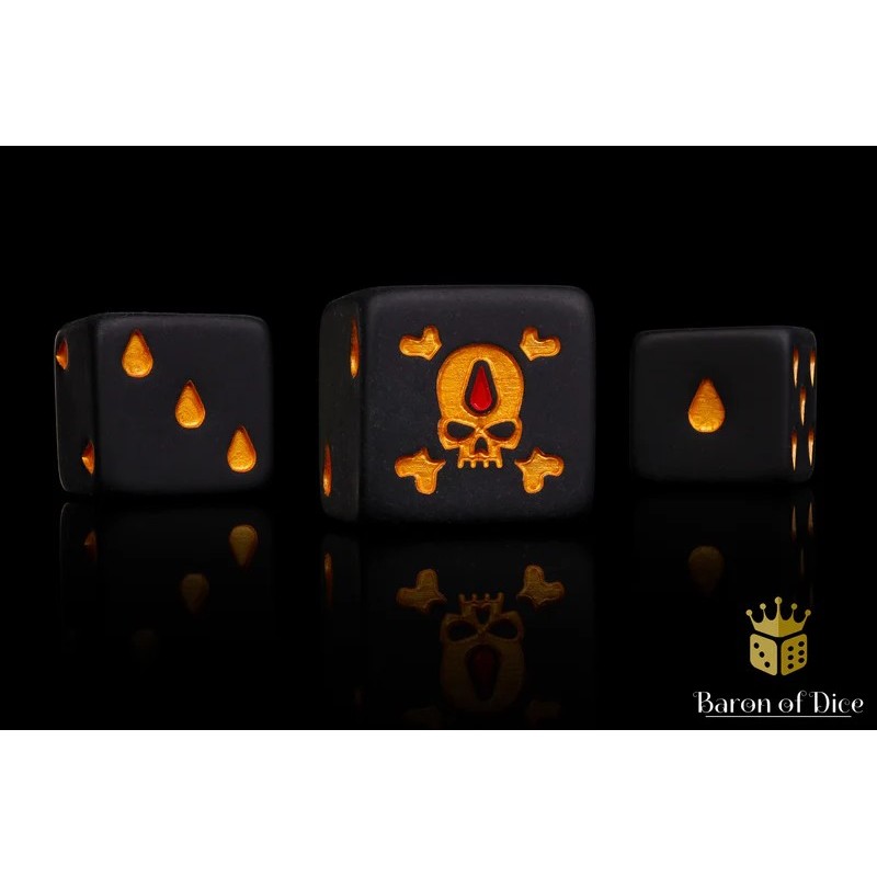 These contain a base of matte black, grim and unnerving, and inlaid with a two-toned metallic gold skull and red blood drop; hand-swirled resin dice.  The symbols are on the 6 side. These dice have an option of round corner, square corner, or 12mm mini, choose wisely! Our premium dice now come in a unique reusable tin.